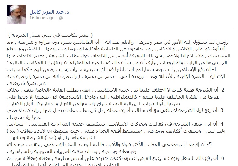 وقال كامل في تدوينة على صفحته بموقع فيسبوك: لا سلاح لنا ولا حصن في تلك المعركة أمضى من الالتفاف حول مطلب الشريعة، وعدم الالتفات عنها إلى غيرها من الرايات والأطروحات وأرى أن من شأن ذلك في المرحلة المقبلة أن يحقق لنا المكاسب التالية :