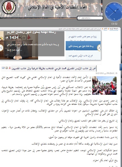 ودعا تشكيلات العمل الإسلامي الموحد، لتنظيم اجتماع خاص بمصر، وتعليق عضوية مصر إلى حين عودة الرئيس المصري المنتخب محمد مرسي وحكومته الى مهامهما.
