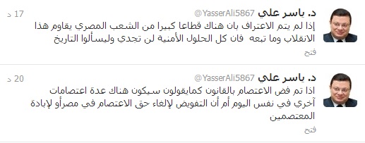 وأضاف على ـ في تغريدة له عبر حسابه على موقع التواصل الاجتماعي تويتر"إذا تم فض الاعتصام بالقانون كمايقولون سيكون هناك عدة اعتصامات آخري في نفس اليوم أم أن التفويض لإلغاء حق الاعتصام في مصرأو لإبادة المعتصمين".