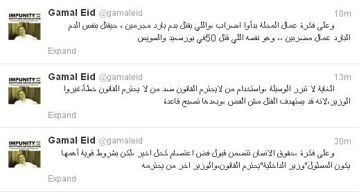 وأكد عيد أن" الصمت عن اصلاح الداخلية وتاريخ من القتل والتعذيب شجع ميلشيات يمينية دينية على حمل السلاح وممارسة التعذيب! تأجيل الاصلاح=مزيد من الخراب" على حد قوله .
