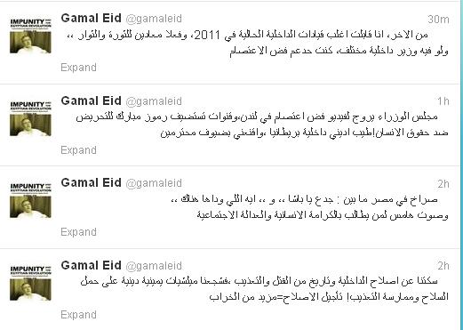 و أضاف عيد في تدويتة له على موقع تويتر للتدوينات القصيرة أن مجلس الوزراء يروج لفيديو فض اعتصام في لندن، وقنوات تستضيف رموز مبارك للتحريض ضد حقوق الانسان، متعجبا "طيب اديني داخلية بريطانيا ،واقنعني بضيوف محترمين".