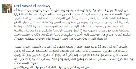 ويأتي كلام البدوي ليؤكد ما ذكرته مؤخرا البرلمانية السابقة – منى مكرم عبيد – والتي كشفت عن أن الجيش طلب الحشد ليوم 30 يونيو من أجل عزل الرئيس محمد مرسي.