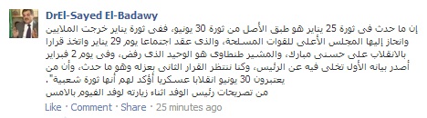قال السيد البدوي – رئيس حزب الوفد – إن ما حدث فى ثورة 25 يناير هو طبق الأصل من ثورة 30 يونيو، ففى ثورة يناير خرجت الملايين وانحاز إليها المجلس الأعلى للقوات المسلحة، وأن من يعتبرون 30 يونيو انقلابا عسكريا أؤكد لهم أنها ثورة شعبية".