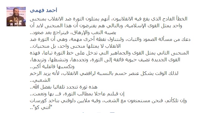 وقال فهمي إنه بغض النظر عن مسألة الصمود والثبات، فلا بد من تناول نقطة أخرى مهمة، وهي أن الثورة ضد الانقلاب لا يمثلها منحنى واحد، بل منحنيان، حيث أن المنحنى الثاني يمثل القوى والجماهير التي تدخل على خط الثورة تباعا، فهذه القوى الجديدة تضيف حيوية فائقة إلى الثورة، وتجددها، وتنشطها، وتزيدها، وتكسبها فاعلية أكبر.