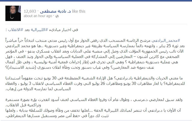 واختتمت "لقد سبق لمعارضي د.مرسي ، وطوال عام أن وفروا الغطاء السياسي لعنف أسود انفجرت بؤره بصورة مستمرة وتراكمية قبل الانقلاب..آن الأوان يا د.برادعي أن تنتصر لمبادئك الليبرالية الحقة …لعلها تخفف من وطأة وصولك للسلطة بدبابة ، ولعلها تثبت لك دوراً في حفظ أمن مصر ومستقبل مسارها الديمقراطي".