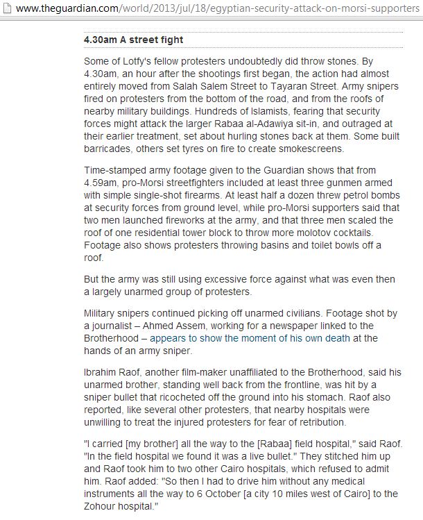 قناصة الجيش كانوا يختارون المدنيين العُزّل. حتى أن الصحفي أحمد عاصم التابع لجريدة تتبع الإخوان قد صور لحظة موته هو شخصيًا على يد قناص من الجيش.