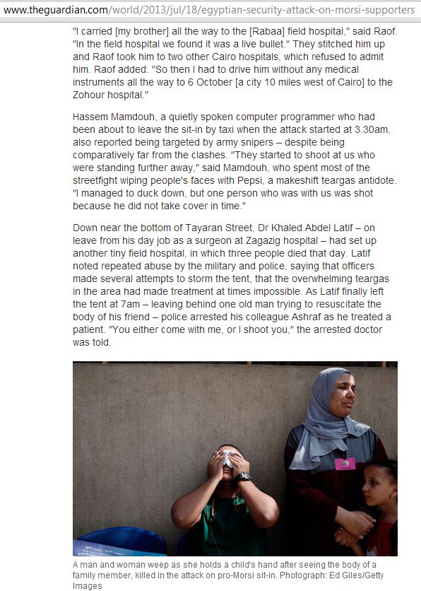 * الصورة للجارديان كتب تحتها : رجل وامرأة يبكيان بعد رؤية جثة احد افراد الاسرة الذي قتل فى الهجوم على اعتصام مؤيدين مرسي
