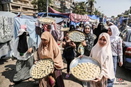 نظمت المعتصمات في رابعة مسيرة اليوم بطعم فرحة العيد، تحمل السيدات والبنات الكعك بشعارات الثورة على الانقلاب العسكري ، ويطفن في أرجاء الميدان الفسيح، وسط فرحة بين المعتصمين بعد أن تحولت الشعارات إلى كعك "صنع في رابعة ".