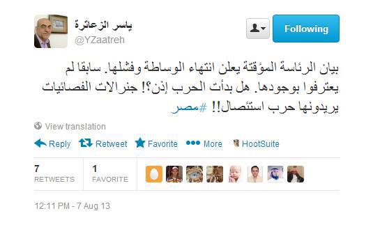 وقال الزعاترة ، في تدوينه له على تويتر، "بيان الرئاسة المؤقتة يعلن انتهاء الوساطة وفشلها. سابقا لم يعترفوا بوجودها. هل بدأت الحرب إذن؟! جنرالات الفصائيات يريدونها حرب استئصال".