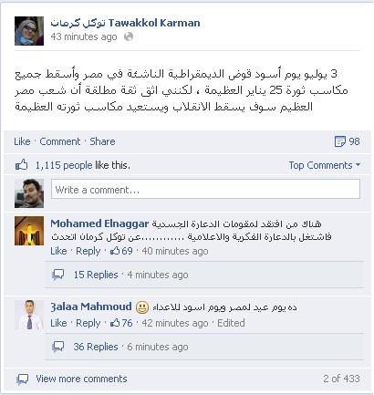 قالت الناشطة اليمنية توكل كرمان والحاصلة على جائزة نوبل للسلام  إن 3 يوليو يوم أسود قوض الديمقراطية الناشئة في مصر وأسقط جميع مكاسب ثورة 25 يناير العظيمة".
