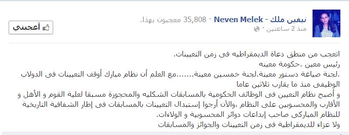 وأضافت ملك عبر تدوينة لها علي موقع "الفيسبوك" أمس (الأثنين) أصبح نظام التعيين فى الوظائف الحكومية بالمسابقات الشكليه والمحجوزة مسبقا لعلية القوم و الأهل و الأقارب والمحسوبين على النظام ,والآن أرجوا إستبدال التعيينات بالمسابقات فى إطار الشفافية التاريخية للنظام المباركى صاحب إبداعات دوائر المحسوبية و الولاءات.