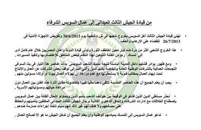 وحذر الجيش الثالث مستغلي الدين الذين فشلوا فى الوقعية بين طوائف الشعب باسم لدين من إشغال الفتنة بين عمال السويس باصطناع الخلافات مع إدارات الشركات والحاق الدعاوي الكاذبة برجال الجيش الثالث الميدانى المكفلين بتأمينهم والحفاظ على مصانعهم ولاهدف لهم غير ذلك أنهم سيتم اتخاذ إجرءات صارمة ضدهم.