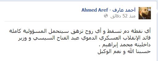 قال د. أحمد عارف-المتحدث الرسمي باسم جماعة الإخوان المسلمين- عبر صفحته الرسمية علي موقع الفيسبوك اليوم (الأربعاء) أن أي نقطة دم تسقط و أي روح تزهق سيتحمل المسؤولية كاملة قائد الإنقلاب العسكري الدموي عبد الفتاح السيسي و وزير داخليته محمد إبراهيم