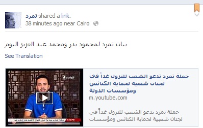 دعت ما تسمى بحملة تمرد الشعب المصري للنزول غدا الجمعة في لجان شعبية بداعي حماية الكنائس ومؤسسات الدولة.