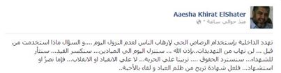 وقال نجلة الشاطر عبر فيس بوك: "تهدد الداخلية بإستخدام الرصاص الحي لإرهاب الناس لعدم النزول اليوم ….و السؤال ماذا استخدمت من قبل … لن نهاب من التهديدات..بإذن الله … سننزل اليوم الي الميادين… سنكسر القيد… سنثأر للشهداء… سنسترد الحقوق …. تربينا علي الحرية… لا علي الانقياد او الانقلاب… فإما نصرُ او استشهاد… فلعل شهادة تريح من ظلم العباد و لقاء بالأحبة".