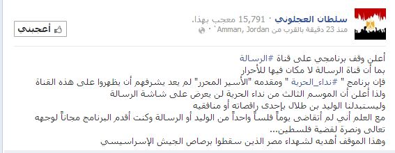 وقال في تدوينة له على الفيس بوك " أعلن وقف برنامجي على قناة الرسالة بما أن قناة الرسالة لا مكان فيها للأحرار، فإن برنامج " نداءالحرية " ومقدمه "الأسير المحرر" لم يعد يشرفهم أن يظهروا على هذه القناة ولذا أعلن أن الموسم الثالث من نداء الحرية لن يعرض على شاشة الرسالة وليستبدلنا الوليد بن طلال بإحدى راقصاته أو منافقيه"