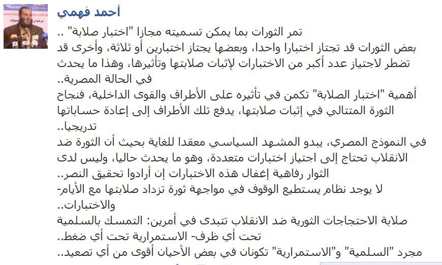 قال الباحث السياسي أحمد فهمي إن الثورات تمر بما يمكن تسميته مجازا "اختبار صلابة"، وبعض الثورات قد تجتاز اختبارا واحدا، وبعضها يجتاز اختبارين أو ثلاثة، وأخرى قد تضطر لاجتياز عدد أكبر من الاختبارات لإثبات صلابتها وتأثيرها، وهذا ما يحدث في الحالة المصرية.