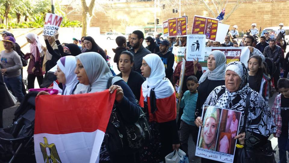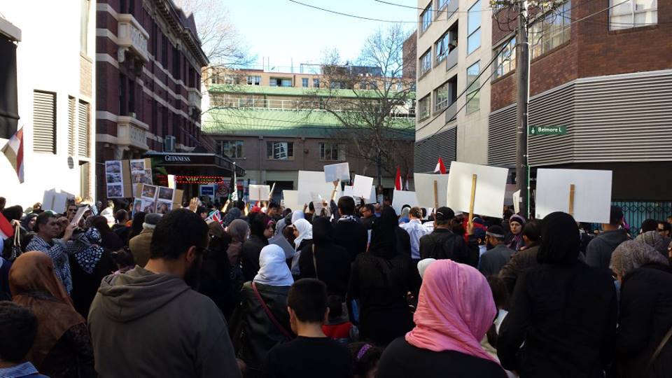 يتظاهر الآن المئات في مدينة سيدني ، تنديدا بالانقلاب العسكري الدموي ومذابحه ضد المصريين.