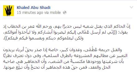 وقال أبو شادي، عبر حسابه الشخصى على "فيسبوك"، اليوم الأحد: " إنّ الحاكم الذي يقتل شعبه ليس جديرًا بهم، ورحم الله عمر بن الخطاب إذ يقول: (إنّي لم أرسل عُمّالي إليكم ليضربوا أبشاركم ولا ليأخذوا أموالكم، ولكن ليعلموكم دينكم ويقسموا فيكم فيئكم).