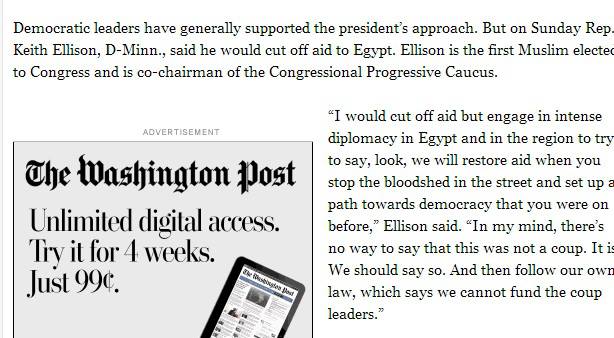 ونقلت واشنطن بوست عن عضو مجلس النواب الأمريكي كيث إليسون، وهو أول مسلم يتم انتخابه في الكونجرس، قوله إنه يؤيد قطع المساعدات عن مصر، وتابع: " سنقطع المساعدات عن مصر، وندخل في جهود دبلوماسية مكثفة لتوصيل رسالة مفادها: انظروا سوف نعيد المساعدات إذا توقفتم عن سفك الدماء، ووضعتم أساسا لطريق ديمقراطي".