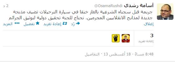 قال أسامة رشدي عضو المجلس القومي لحقوق الانسان عبر تويتر إن "جريمة قتل سجناء الشرعية بالغاز خنقا في سيارة الترحيلات تضيف مذبحة جديدة لمذابح الانقلابيين المجرمين".