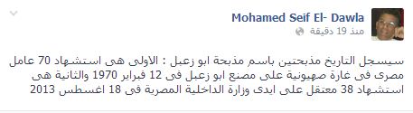 قال محمد سيف الدولة – الباحث المتخصص في الشأن القومى العربي- في تدوينة له على صفحته على الفيس بوك "سيسجل التاريخ مذبحتين باسم مذبحة أبو زعبل : الأولى هى استشهاد 70 عامل مصرى فى غارة صهيونية على مصنع أبو زعبل فى 12 فبراير 1970 والثانية هى استشهاد 38 معتقل على ايدى وزارة الداخلية المصرية فى 18 اغسطس 2013"