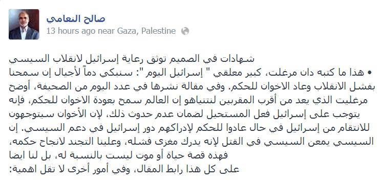 وذكر النعامي على صفحته بموقع فيس بوك ما كتبه دان مرجلت، كبير معلقي صحيفة "إسرائيل اليوم" والذي قال بالنص: سنبكي دماً لأجيال إن سمحنا بفشل الانقلاب وعاد الإخوان للحكم.