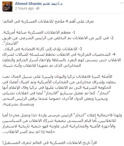 وقال غانم في تدوينه له علي موقع "الفيسبوك" أن الشخصيات المركزية في الانقلاب تخطط لسلسلة اغتيالات لشركاء الانقلاب حتى يتسنى لهم التفرد بالسلطة ولإخفاء أسرار الجرائم والتعاون المخابراتي الذي تم تمهيدا للانقلاب وأثناء تثبيته.