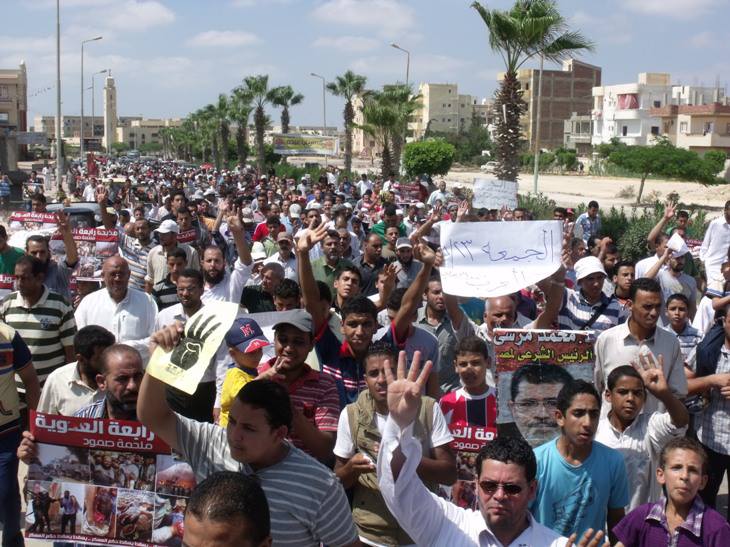 وانطلقت مسيره من مسجد االـ800 وسط مشاركه شعبيه واسعه من أهالى المدينه مرددين هتافات: " المره دى بجد ….. مش هنسبها لحد "، "اضرب نار اضرب مطاطى . احنا كرهنا الصوت الواطى"، "سيسى يا سيسى … مرسى رئيسى.