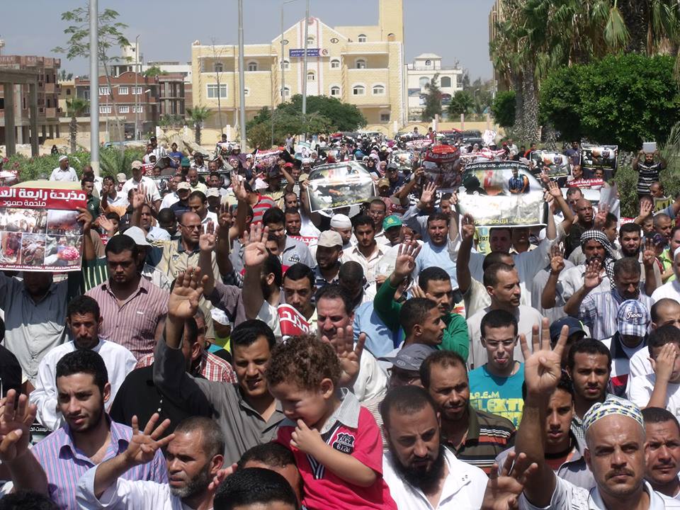 ورفع المتظاهرون إشارت النصر "رابعة العدوية".