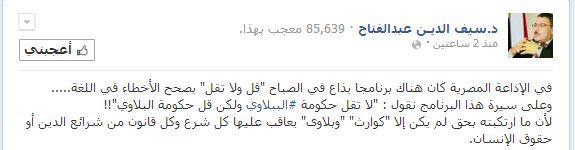 وقال عبد الفتاح على صفحته الشخصية على موقع التواصل الاجتماعي " فيس بوك " : "في الإذاعة المصرية كان هناك برنامجا يذاع في الصباح "قل ولا تقل" يصحح الأخطاء في اللغة وعلى سيرة هذا البرنامج نقول : "لا تقل حكومة #الببلاوي ولكن قل حكومة البلاوي"!!".