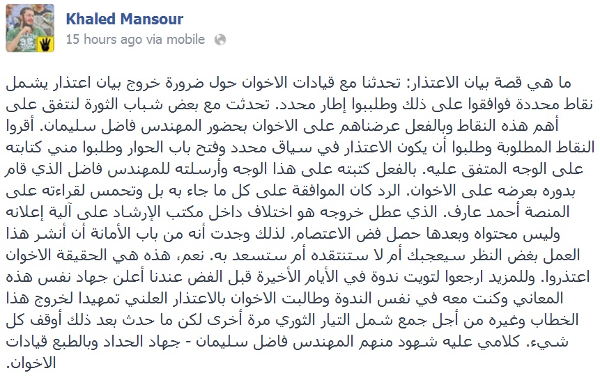 وقال منصور: تحدثنا مع قيادات الاخوان حول ضرورة خروج بيان اعتذار يشمل نقاط محددة فوافقوا على ذلك وطلبوا إطارًا محددًا، فتحدثت مع بعض شباب الثورة لنتفق على أهم هذه النقاط وبالفعل عرضناها على الاخوان بحضور المهندس فاضل سليمان، وتم إقرار النقاط المطلوبة.