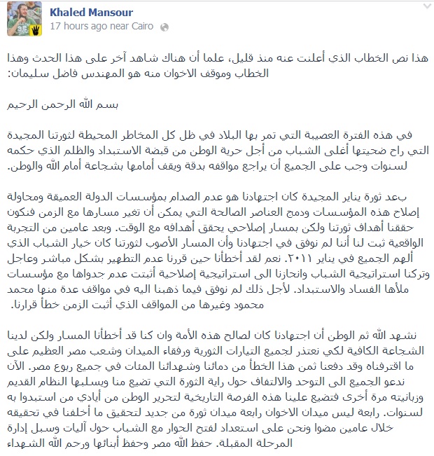 نشهد الله ثم الوطن أن اجتهادنا كان لصالح هذه الأمة وان كنا قد أخطأنا المسار ولكن لدينا الشجاعة الكافية لكي نعتذر لجميع التيارات الثورية ورفقاء الميدان وشعب مصر العظيم على ما اقترفناه وقد دفعنا ثمن هذا الخطأ من دمائنا وشهدائنا المئات في جميع ربوع مصر. الآن ندعو الجميع الى التوحد والالتفاف حول راية الثورة التي تضيع منا ويسلبها النظام القديم وزبانيته مرة أخرى فتضيع علينا هذه الفرصة التاريخية لتحرير الوطن من أيادي من استبدوا به لسنوات. رابعة ليس ميدان الاخوان رابعة ميدان ثورة من جديد لتحقيق ما أخفقنا في تحقيقه خلال عامين مضيا ونحن على استعداد لفتح الحوار مع الشباب حول آليات وسبل إدارة المرحلة المقبلة. حفظ الله مصر وحفظ أبنائها ورحم الله الشهداء