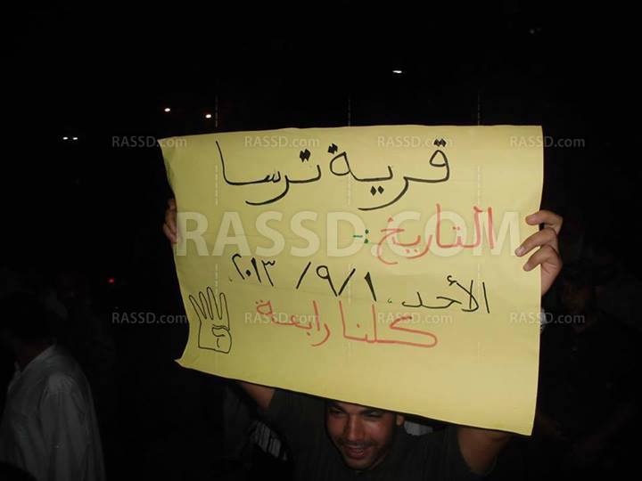 نظمت المتظاهرون الرافضون للانقلاب بقرية ترسا بمحافظة الجيزة مساء أمس مسيرة ضد الانقلاب العسكري، ومجازره.