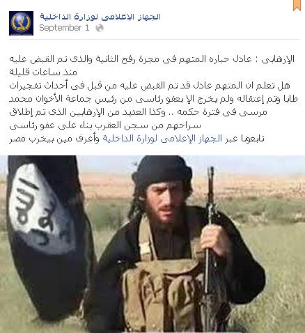 نشر الجهاز الاعلامى لوزارة الداخلية على صفحته الرسمية على موقع التواصل الاجتماعي "فيس بوك" اليوم الاثنين خبر عن عادل حبارة المتهم في مجزرة رفح مرفقين بالخبر صورة عادل حبارة إلا أن نشطاء موقع التواصل الاجتماعي اكتشفوا ان الصورة المرفقة بالخبر ليست صورة عادل حبارة .