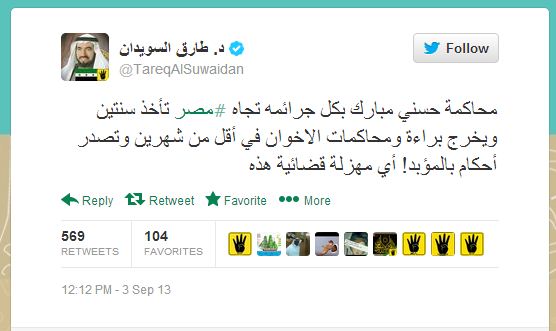 قال د. طارق سويدان-الداعية والمفكر الإسلامي- أن محاكمة حسني مبارك بكل جرائمه تجاه مصر أخذت عامينثم أخذ براءة بينما محاكمات الاخوان تمت في أقل من شهرين ووصدرت تجاهم أحكام بالمؤيد .