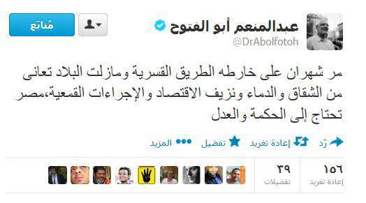 وقال أبو الفتوح، عبر حسابه على تويتر، "مر شهران على خارطه الطريق القسرية ومازلت البلاد تعانى من الشقاق والدماء ونزيف الاقتصاد والإجراءات القمعية،مصر تحتاج إلى الحكمة والعدل".