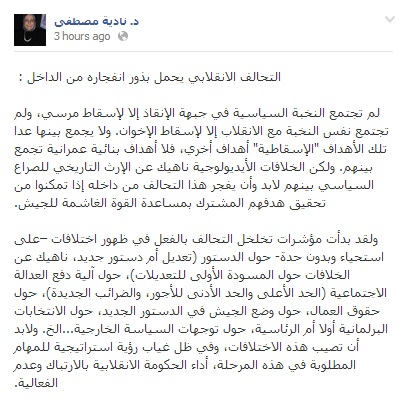 وقالت مصطفى ـ في تعليق لها على صفحتها للتواصل الاجتماعي فيس بوك "لم تجتمع النخبة السياسية في جبهة الإنقاذإلا لإسقاط مرسي ،ولم تجتمع نفس النخبة مع الانقلاب إلا لإسقاط الإخوان. ولا يجمع بينها عدا تلك الأهداف "الإسقاطية"أهداف أخري ،فلا أهداف بنائية عمرانية تجمع بينهم".