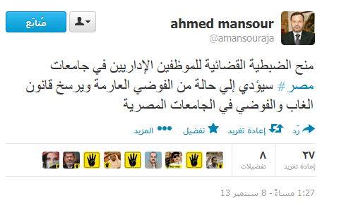 أكد الإعلامي أحمد منصور، عبر حسابه على تويتر، أن منح الضبطية القضائية للموظفين الإداريين في جامعات مصر سيؤدي إلي حالة من الفوضي، و ترسيخ  لقانون الغاب  في الجامعات المصرية.