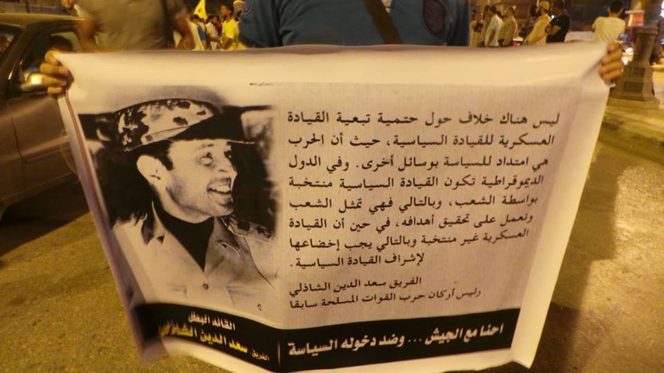 وتقدمت المسيره صوره الفريق سعد الشاذلى ورسالة مكتوبة له حول خطورة عمل الجيش بالسياسة .