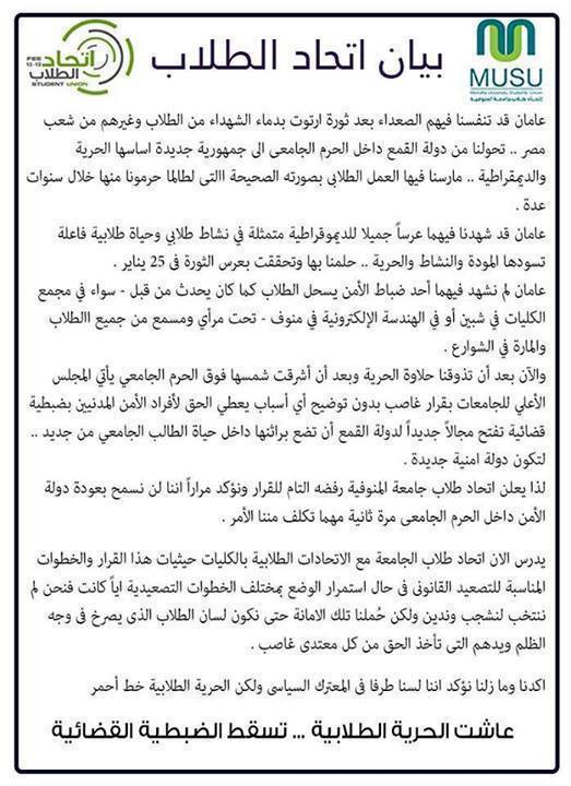 وقال اتحاد طلاب جامعة المنوفية في بيان له أن الضبطية القضائية فتحت مجال جديد لدولة القمع أن تضع براثنها داخل حياة الطلبة الجامعيين معلنًا رفضه للقرار وأنه لن يسمح بعودة دولة القمع.