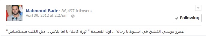 تداول نشطاء على موقع التواصل الاجتماعي فيس بوك ، تعليقا لمحمود بدر مؤسس حركة تمرد ، وهو يسب  عمرو موسى ،رئيس لجنة الخمسين لتعديل الدستور حاليا ،  في أبريل عام 2012 قائلا "عمرو موسي اتفشخ في اسيوط يا رجالة .. اول القصيدة " ثورة كاملة يا اما بلاش .. ديل الكلب ميحكمناش" وكان هذا الكلام في 30 أبريل عام 2012.