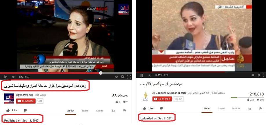 أعد التليفزيون المصري أمس تقريرا تحت عنوان "ردود فعل المواطنين حول قرار مد حالة الطوارئ بالبلاد لمدة شهرين" ويظهر في التقرير ابتداءا من "الدقيقة 1:03 وحتي الدقيقة 1:26" … سيدة سبق أن أجرت قناة الجزيرة مباشر مصر لقاء معها بتاريخ 7 سبتمبر 2011 م على هامش الجلسة الرابعة لمحاكمة المخلوع مبارك ونجليه والعادلي ومساعديه في قضية قتل المتظاهرين التي عرفت إعلاميا بإسم "محاكمة القرن".