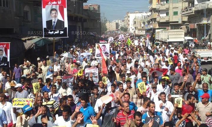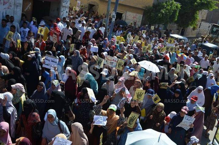 كما احتشدت منطقة حوش عيسي بالبحيرة أمس تنديدًا بالانقلاب، رافعين اللأعلام المصرية وعلامات النصر رابعة.
