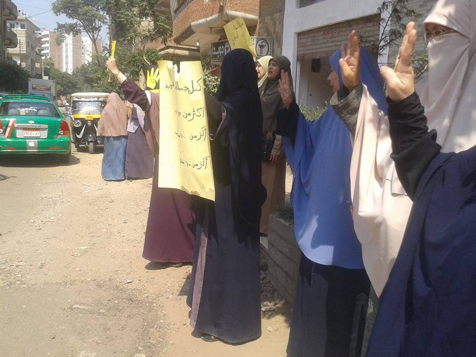 ورفع المتظاهرات لافتات تندد باعتقال النساء وقتلهن واعتقال ازواجهن وابنائهن ومنها انا مصرية مش ارهابية لا لإعتقال النساء لا للانقلاب العسكرى نعم للشرعية ثورتنا ثورة سلمية"،"قتلوا أخويا وحرقوا الجثة"،"ممكن أختلف معك.. لكن كلنا ضد العسكر"،"مش بنخاف مش بنطاطي"..