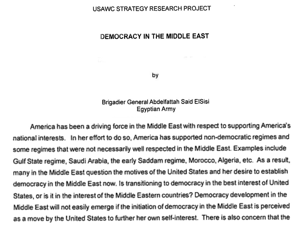 وقال السيسي خلال الورقة البحثية: "أمريكا قوة دافعة في الشرق الأوسط فيما يتعلق بمصالحها القومية، وفي إطار جهودها لتحقيق ذلك، دعمت أمريكا أنظمة غير ديمقراطية،  وبعض الأنظمة التي لا تحظى بالضرورة بالاحترام في الشرق الأوسط، وأمثلة لذلك الخليج، والسعودية،  ونظام صدام حسين في بدايته،  والمغرب والجزائر".