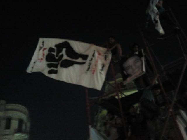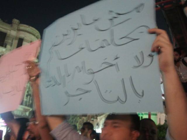 ورفع المشاركون لافتات "أمن الدولة كلاب الدولة" ، "مش عاوزين يحكمنا عساكر ولا إخوان بالدين بالتاجر".