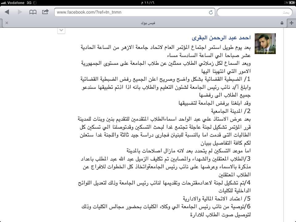 وبخصوص الطلاب المعتقلين والشهداء والمصابين أوضح البقري أنه تم تكليف الزميل عبد الله عبد المطلب بإعداد مذكرة بالأسماء وعرضها على نائب رئيس الجامعة، واتخاذ كل الخطوات للافراج عن الطلاب المعتقلين.