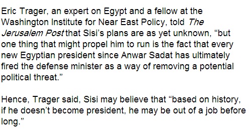 نقلت صحيفة جيروزاليم بوست الإسرائيلية عن اريك تراجر الخبير الأمريكي في الشأن المصري،  وزميل معهد واشنطن لسياسة الشرق الأدنى قوله إن الشيء الذي قد يدفع  الفريق عبد الفتاح السيسي وزير الدفاع للترشح لرئاسة الجمهورية هو حقيقة أن كل رئيس مصري منذ أنور السادات قام بإقصاء وزير الدفاع كوسيلة لدرء أي تهديد سياسي محتمل".