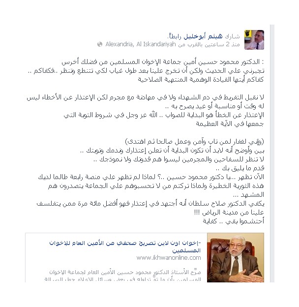 انتقد هيثم أبو خليل -مدير مركز ضحايا لحقوق الإنسان-تصريحات د. محمود حسين-الامين العام لجماعة الإخوان المسلمين- بشأن وصفه لاعتذار أحد قيادات جماعة الإخوان المسلمين عن اخطاء وقعت الفترة الماضية برأيه الشخصي.
